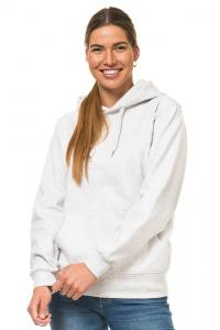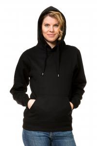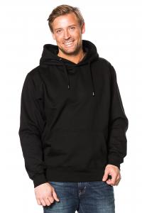 Luvtröja (hoodie) i hög kvalitet med genomgående ficka fram, dubbel huva med platta breda snören, bred lycra i rib och lätt borstad insida. Dubbelsömmar och sidosömmar.
