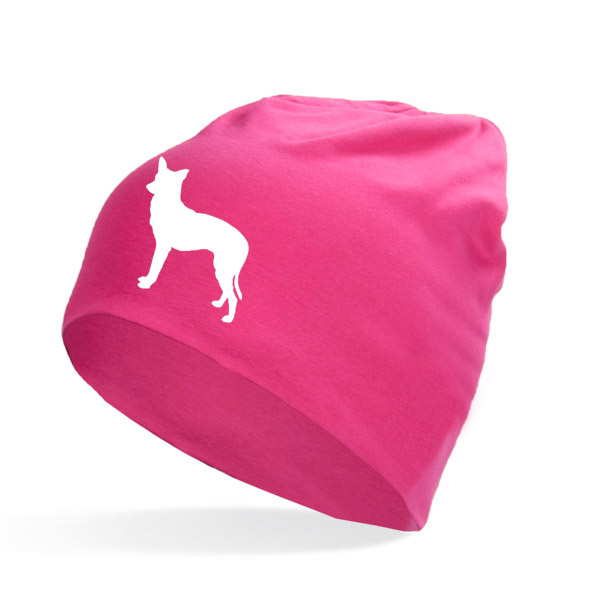 Tunn barnmössa i bomull/elastan med ett siluettmotiv av en Podengo Portugues. Mössan finns i flera färger.