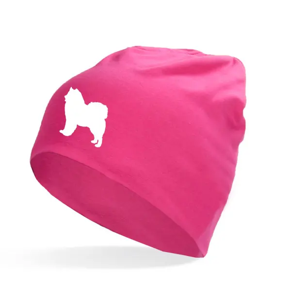 Tunn barnmössa i bomull/elastan med ett siluettmotiv av en Samojed. Mössan finns i flera färger.
