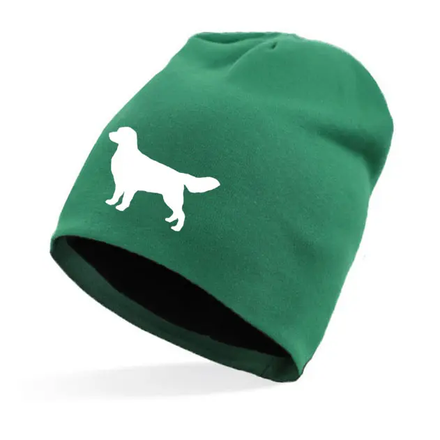 Mössa i bomull/elastan med fleecefoder och med ett siluettmotiv av en Golden Retriever. Mössan finns i flera färger.