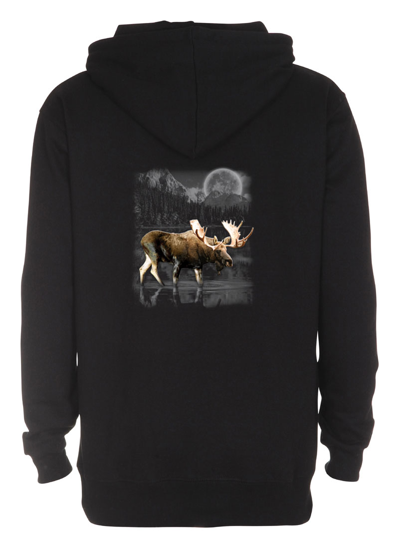 Härlig huvjacka med ett Älgmotiv tryckt på ryggen. Motivstorlek ca 30 x 34 cm.