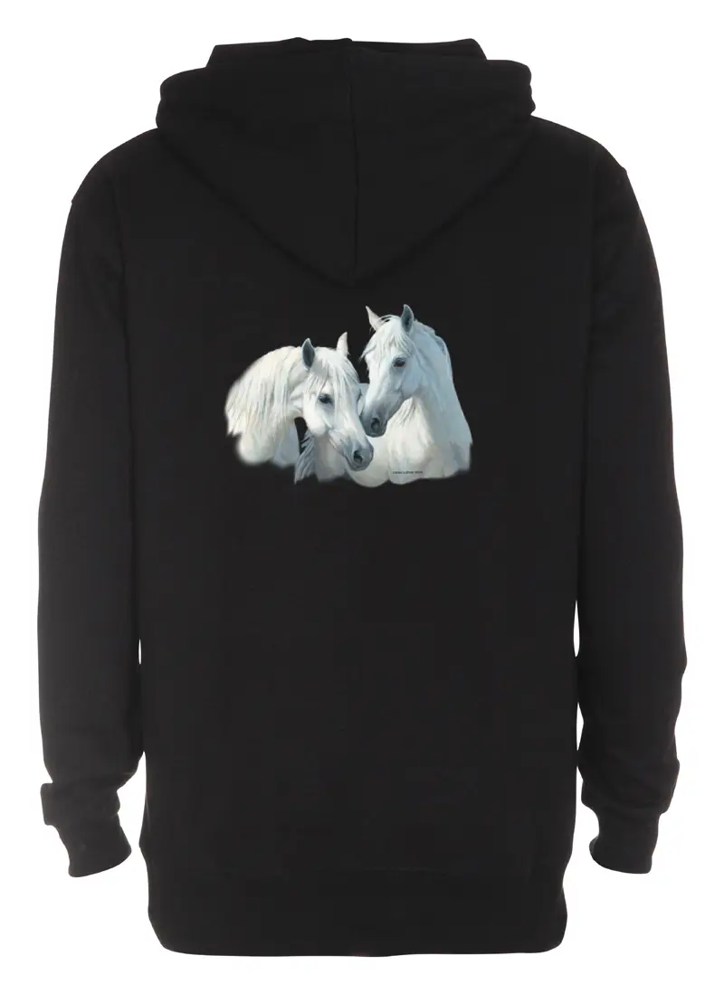 Härlig huvjacka med ett hästmotiv tryckt på ryggen. Motivstorlek ca 36x26 cm.