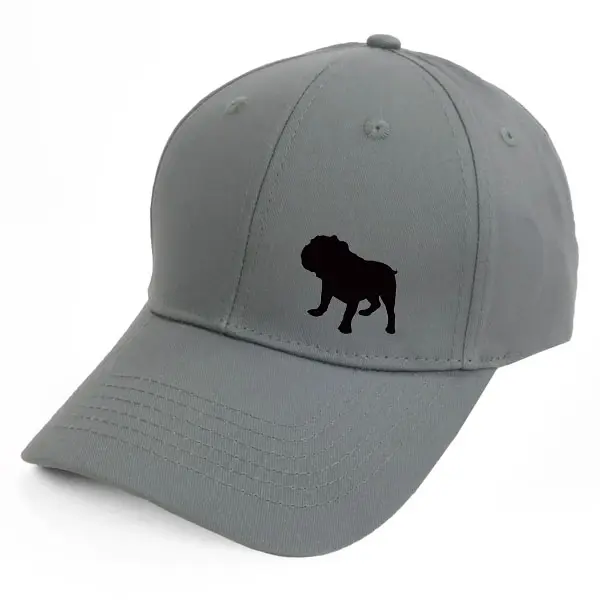 Keps i borstad bomullstwill med böjd skärm och kardborrespänne och med ett siluettmotiv av en Engelsk Bulldogg.