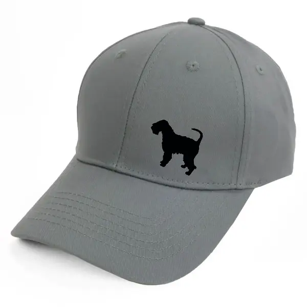Keps i borstad bomullstwill med böjd skärm och kardborrespänne och med ett siluettmotiv av en Irish Softcoated Wheaten Terrier