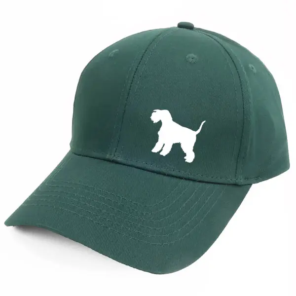 Keps i borstad bomullstwill med böjd skärm och kardborrespänne och med ett siluettmotiv av en Lakelandterrier.