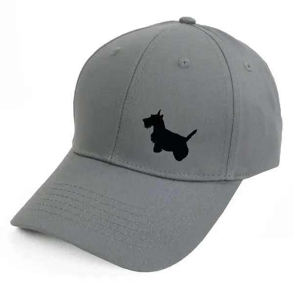 Keps i borstad bomullstwill med böjd skärm och kardborrespänne och med ett siluettmotiv av en Skotsk Terrier