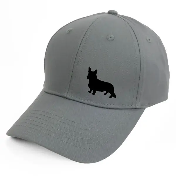 Keps i borstad bomullstwill med böjd skärm och kardborrespänne och med ett siluettmotiv av en Welsh Corgi Cardigan.