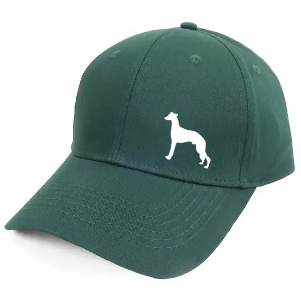 Keps i borstad bomullstwill med böjd skärm och kardborrespänne och med ett siluettmotiv av en Whippet. Siluettbilden är ca 3,5 cm hög.