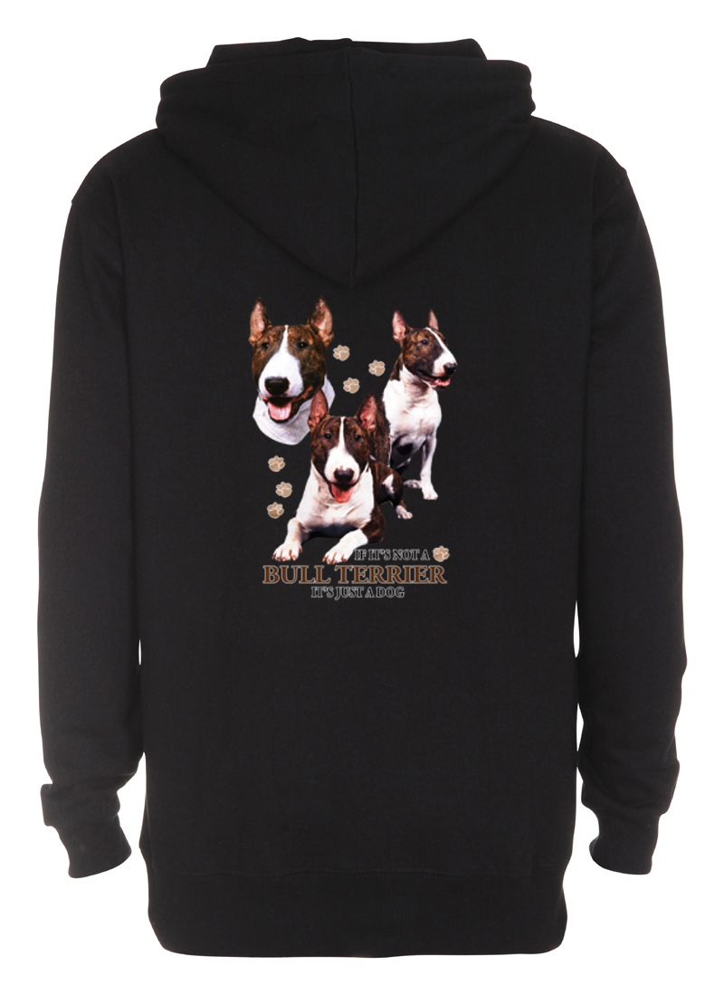 Luvtröja i bra kvalitet med ett motiv av Bullterrier tryckt på ryggen. Motivstorlek ca 20 x 26 cm.