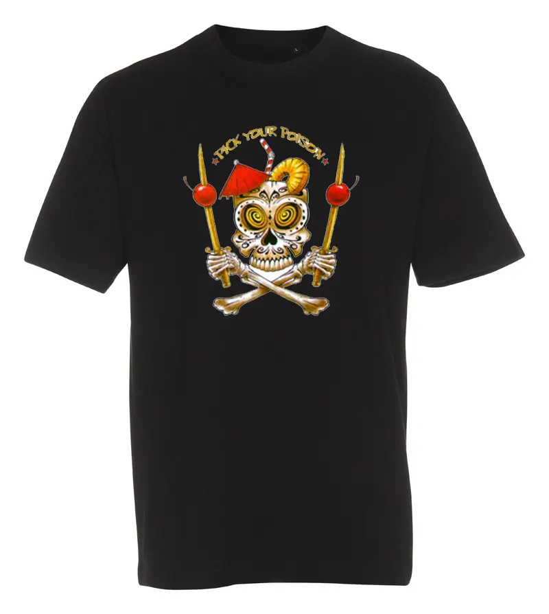 Svart t-shirt i bra kvalitet med ett Pirates and Skullsmotiv tryckt på bröstet.