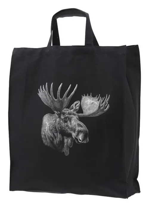 Miljövänlig tygkasse 41x45cm med 17,5cm botten i 100% bomull 250g med ett motiv av ett Älghuvud . Motivstorlek ca 24x24cm.