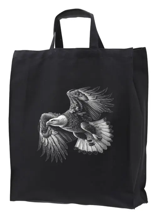 Miljövänlig tygkasse 41x45cm med 17,5cm botten i 100% bomull 250g med ett motiv av en Örn. Motivstorlek ca 24x24cm.